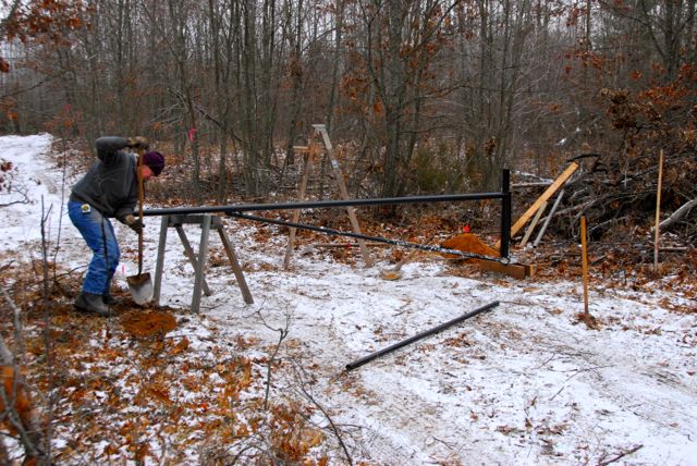 This weekend with a lot of help from people we were able to get in most of the “infrastructure” needs for this winter’s trail use. Below is Bob our master gate builder installing one of his creations.